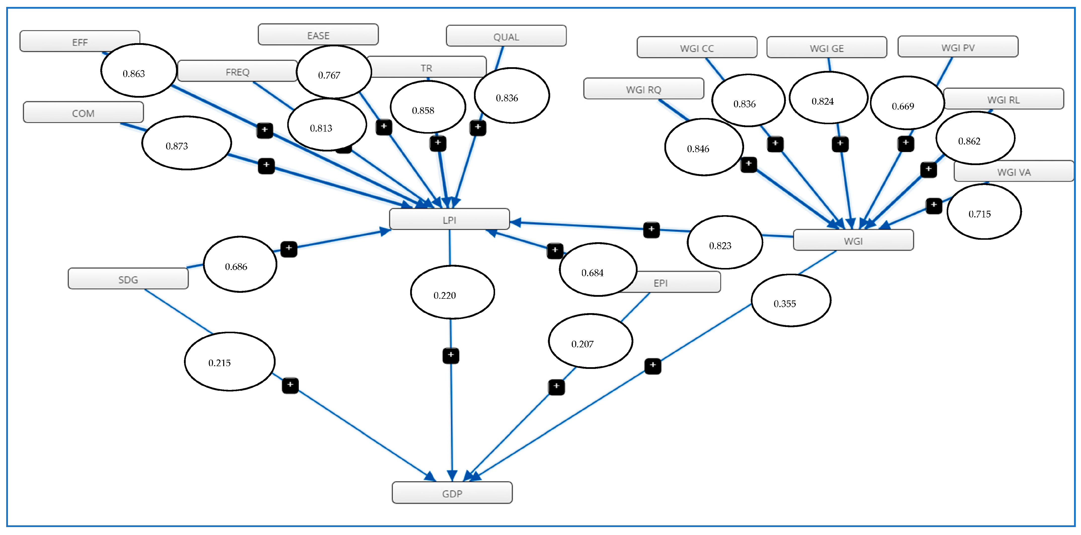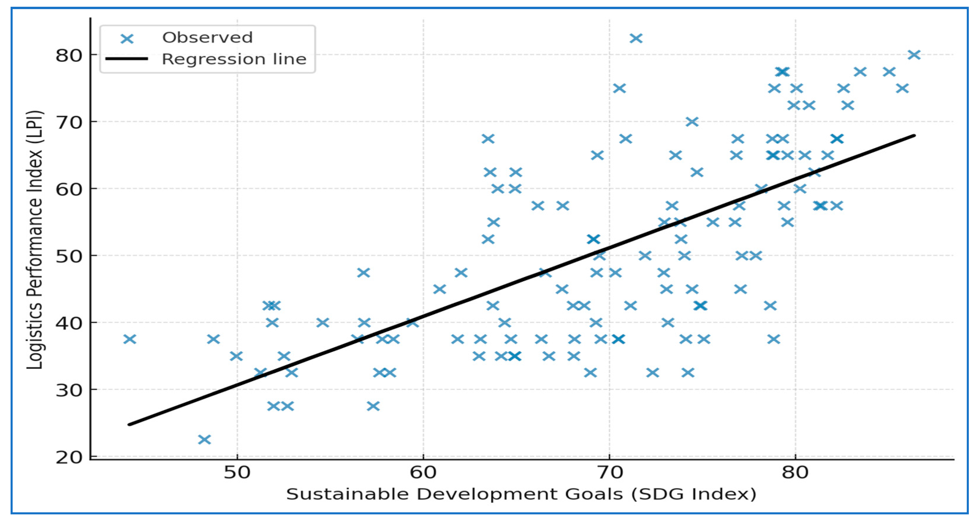 The empirical results confirm a statistically significant and conceptually consistent relationship among logistics performance, governance quality, environmental sustainability, and economic output. Logistics efficiency and institutional coherence—captured through the World Bank’s Logistics Performance Index (LPI) and Worldwide Governance Indicators (WGI)—emerge as the strongest predictors of GDP per capita, underscoring their foundational role in economic development. In parallel, sustainability indicators such as the Environmental Performance Index (EPI) from Yale University and the Sustainable Development Goals Index (SDG), compiled by Dublin University, contribute to reinforcing long-term developmental integrity. The use of these high-quality, internationally validated datasets enhances the credibility of the analysis, while the models’ strong explanatory power (R2 > 0.80) confirms the robustness of the observed relationships. Collectively, the findings highlight that economic performance is structurally embedded within broader systems of governance, infrastructure, and sustainability.