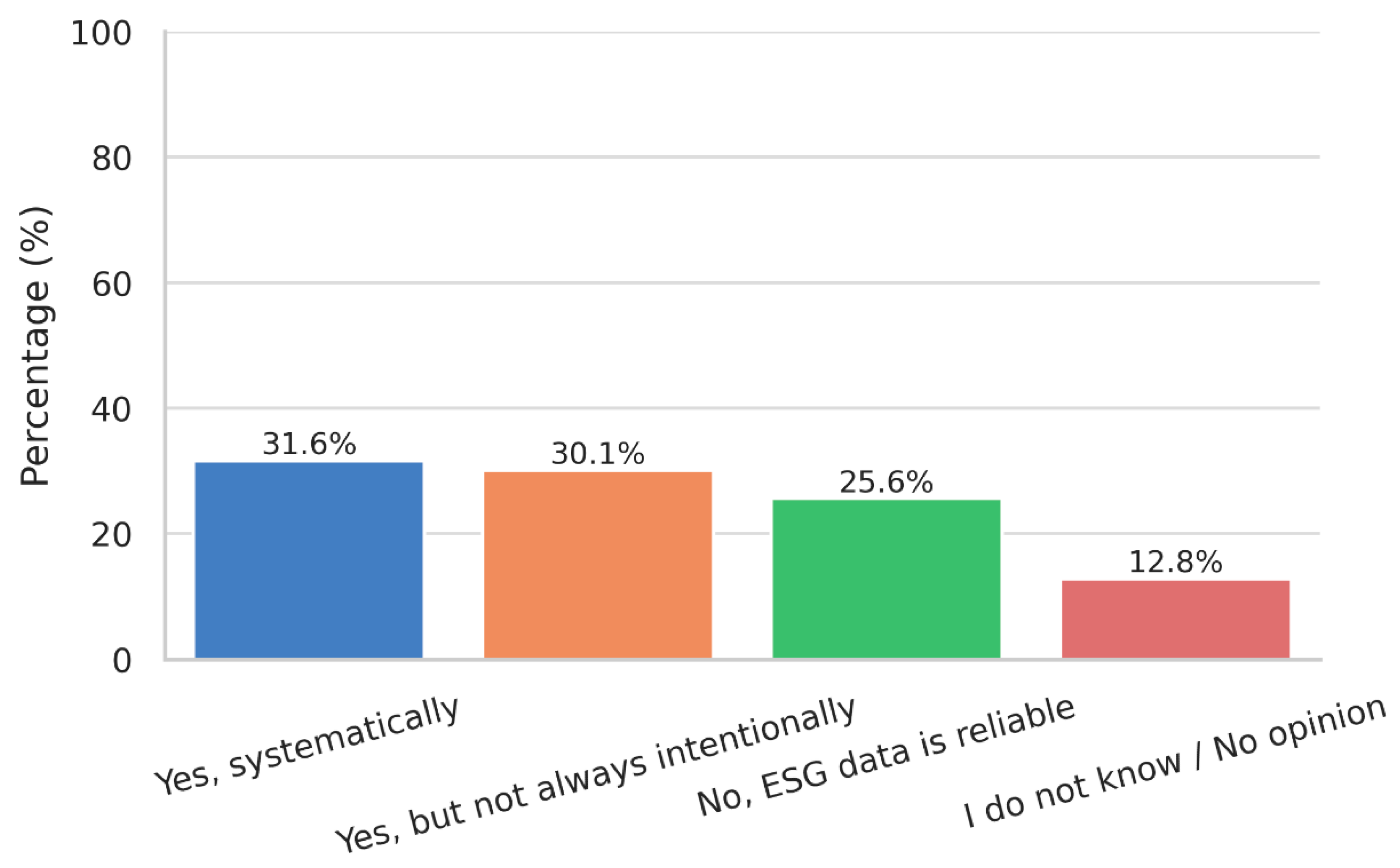 Turning to the perceived prevalence of ESG-washing, the data reveal that 31.6% believe such practices occur