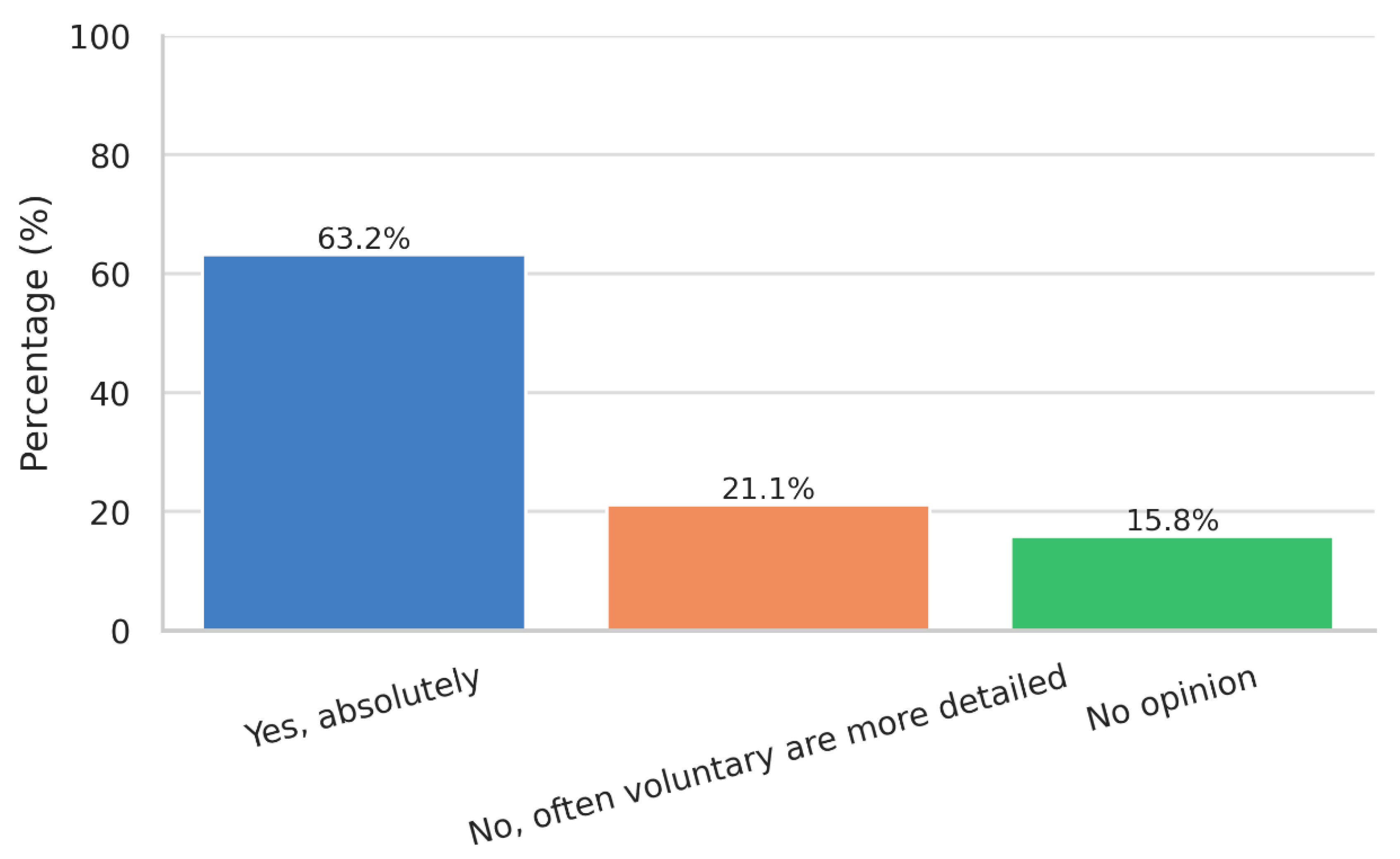 With respect to the credibility of reporting formats, most respondents expressed greater trust in mandatory ESG disclosures compared to voluntary ones. This is consistent with regulatory trust theory, which argues that legally mandated frameworks tend to be perceived as more reliable due to formal oversight and sanctions for non-compliance [