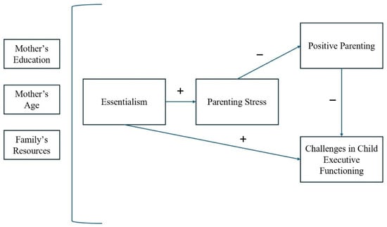 - H4: Parenting stress and positive parenting would sequentially explain the association between maternal essentialism and children’s EF skills.