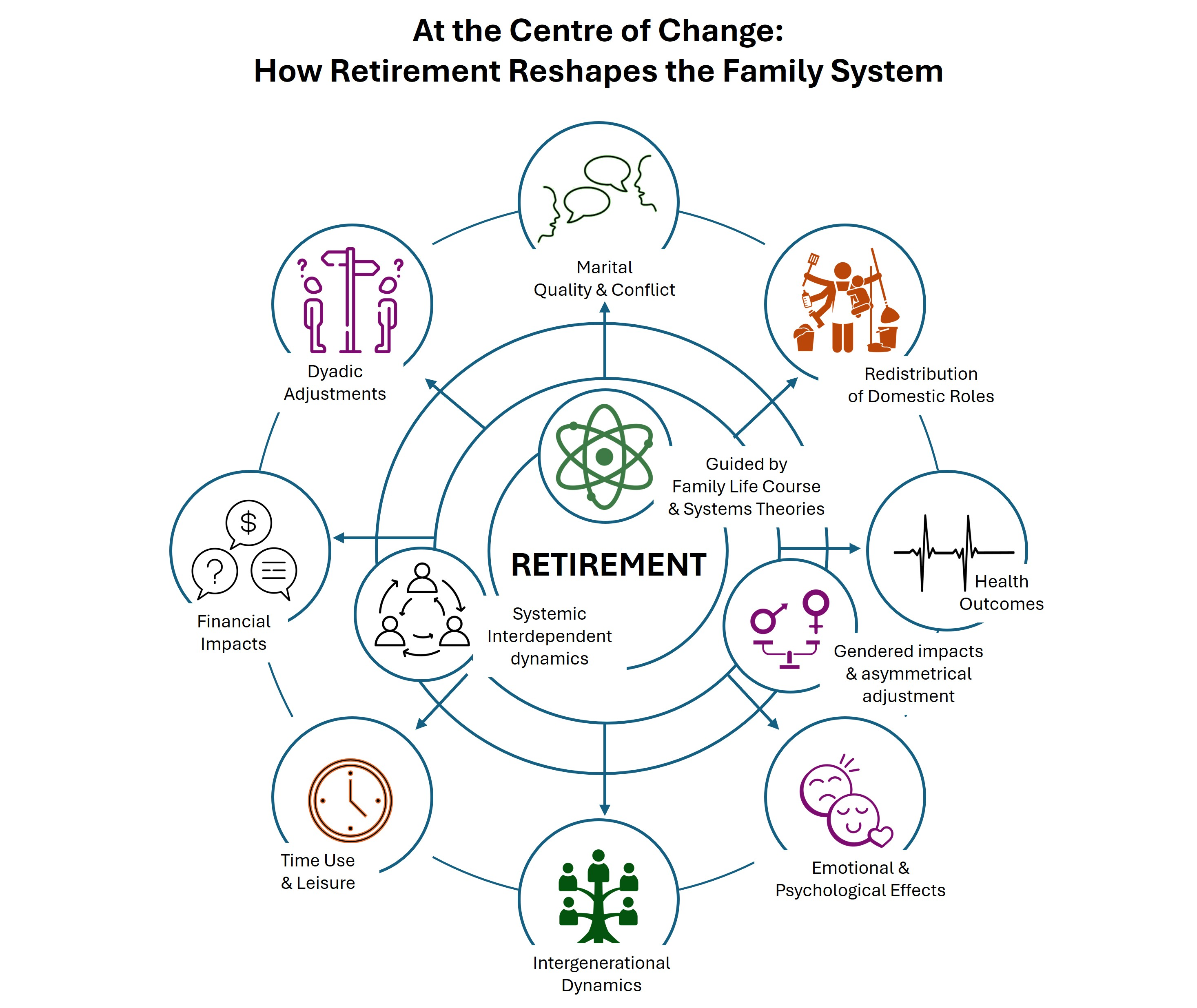 | (Loureiro et al., 2015) | Portugal | qualitative cross- sectional | emotional & psych. effects; redistribution of domestic roles; dyadic adjustments | Retirement impacts the family system, producing gains/losses and relearning roles/emotions/identity within the family. |