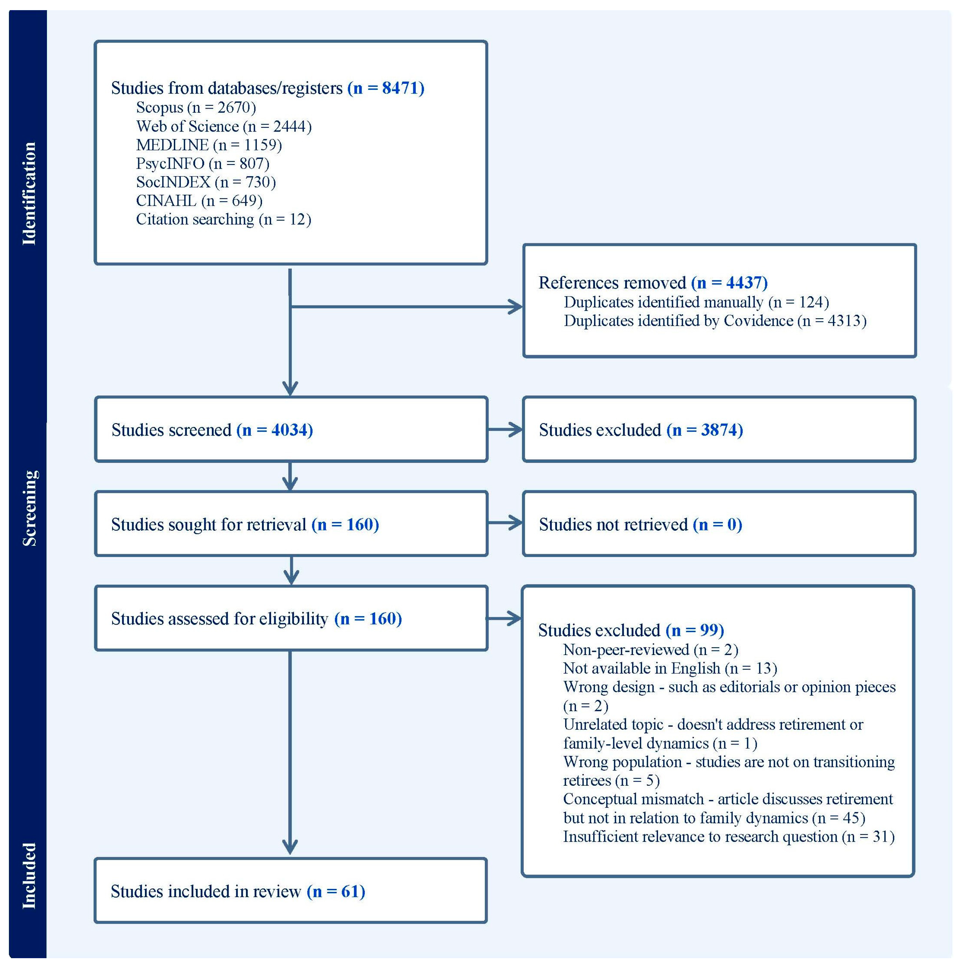 Chicago/Turabian StyleCox, Marilyn, and Heidi Cramm. 2026. "The Family in Transition: A Scoping Review of Retirement’s Relational Impacts" Family Sciences 2, no. 1: 4. https://doi.org/10.3390/famsci2010004
