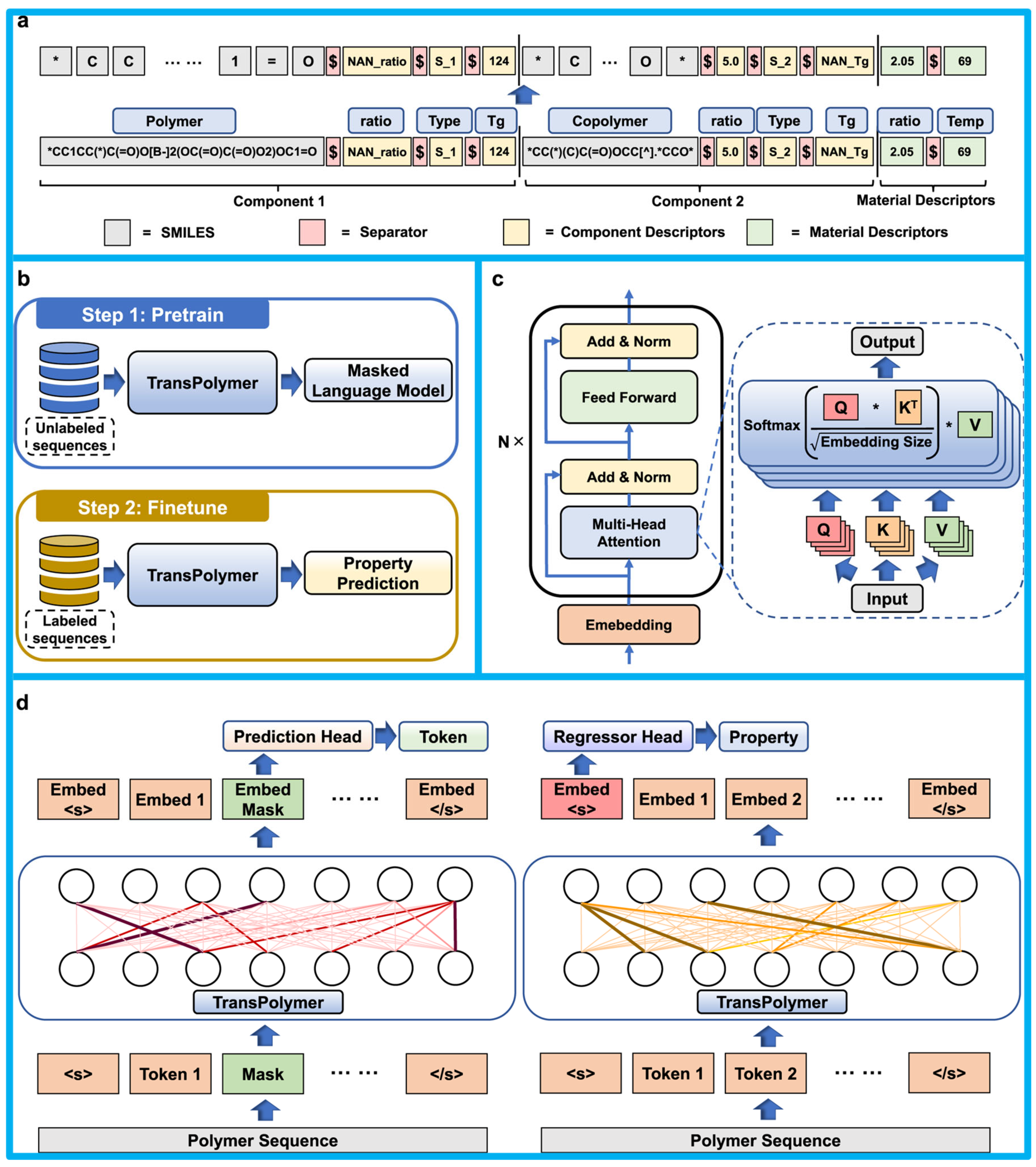 - Xu, C.; Wang, Y.; Barati Farimani, A. TransPolymer: A Transformer-based language model for polymer property predictions. npj Comput. Mater. 2023, 9, 64. [Google Scholar] [CrossRef]