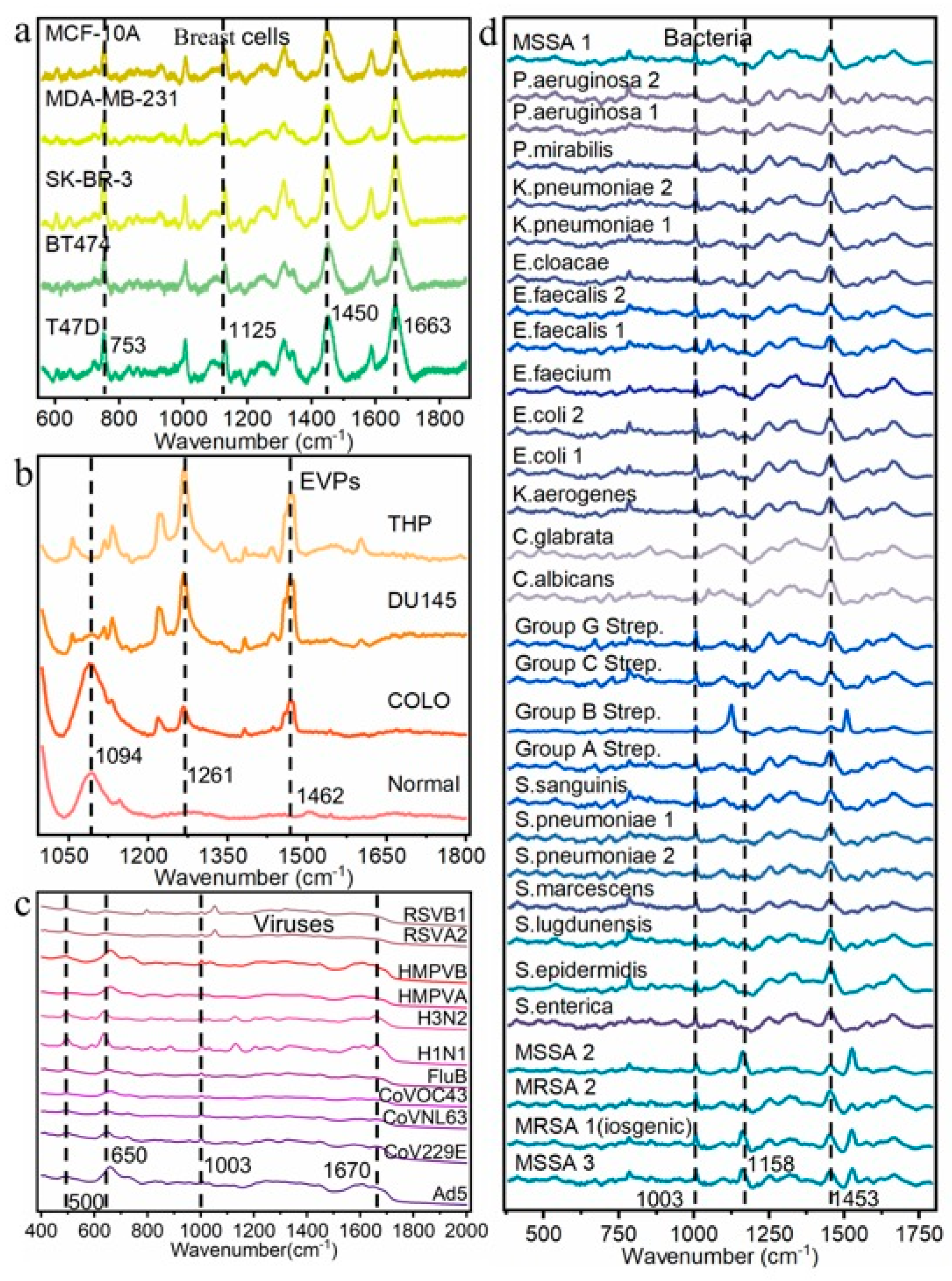 | 5 Breast Cells | 4 EVPs | 11 Viruses | 30 Bacteria | |
