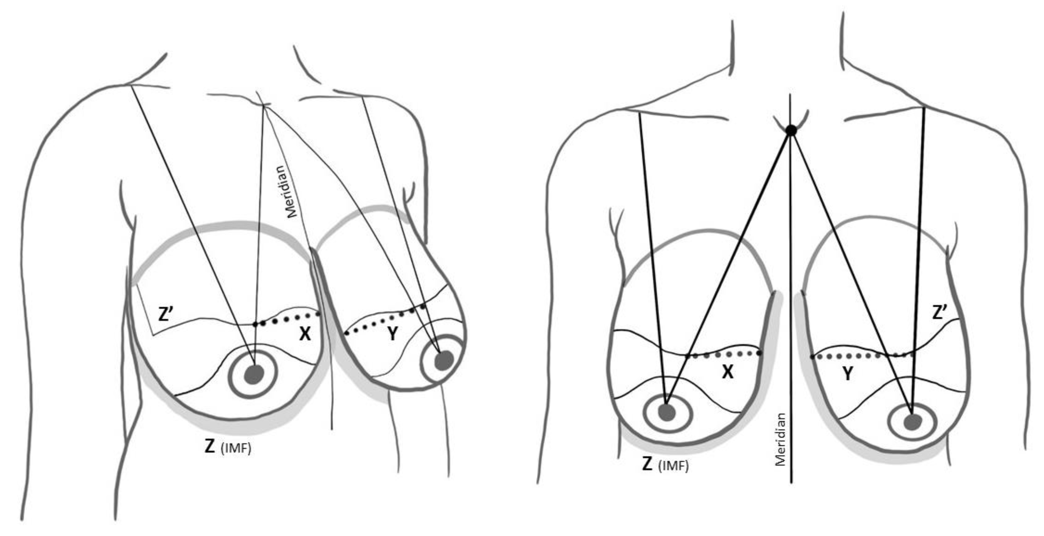Figure 1). For an implant projection of 5 cm or more, the equation is adjusted to Z’ = Z + 4. For a projection less than 5 cm, the equation is adjusted to Z’ = Z + 2. Z is the inframammary fold (IMF). Z’ is the measurement width of the new breast pocket that will be created. X is the distance from the meridian to the edge of the medial triangle. Y is the distance from the meridian to the edge of the lateral triangle. These triangles allow for a predictable and proportional reduction in the circumference of the breast envelope.