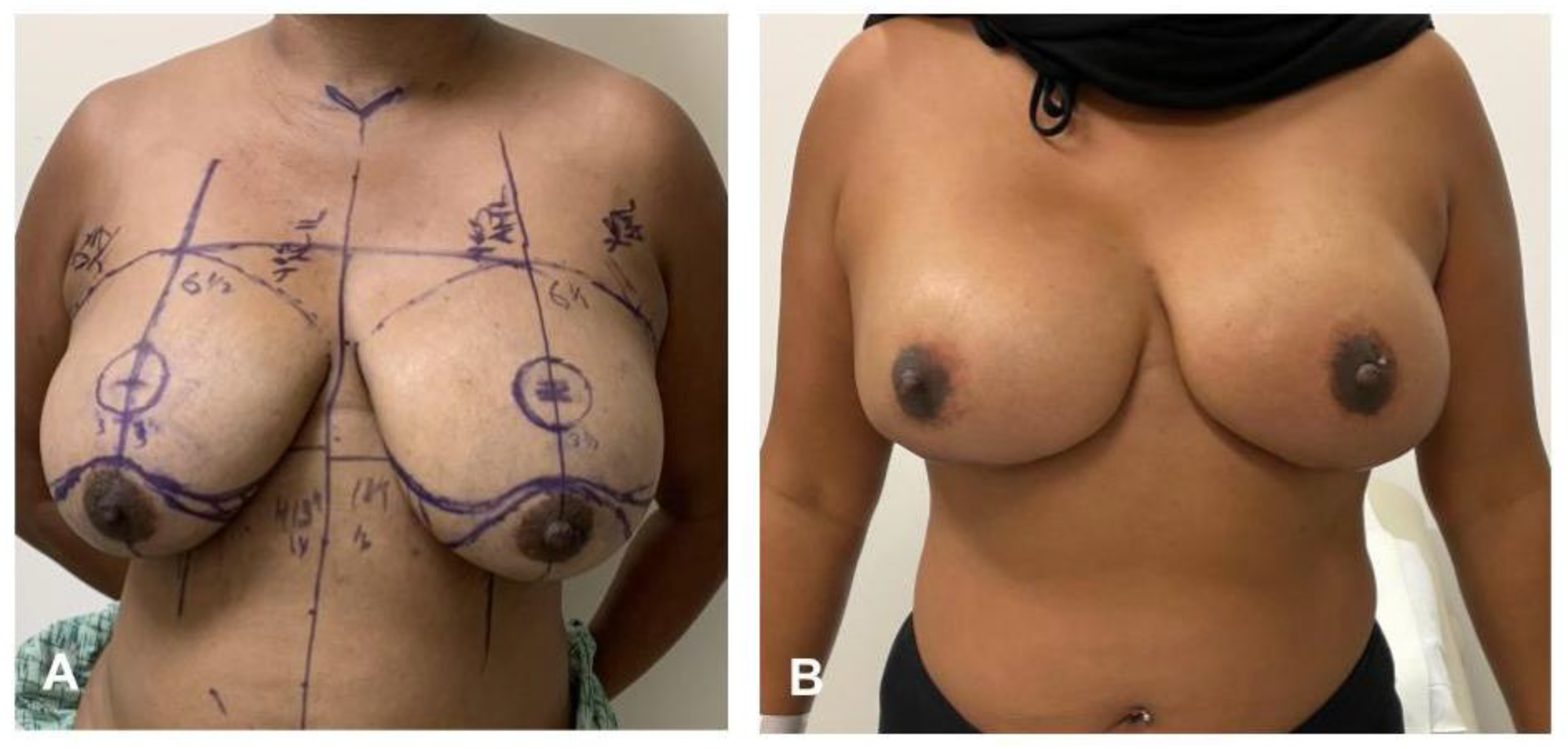 - Movassaghi, K.; Liao, E.C.; Ting, V.; Matros, E.; Morris, D.J.; Orgill, D.P.; Pribaz, J.J. Eliminating the vertical scar in breast reduction-Boston modification of the Robertson technique. Aesthet. Surg. J. 2006, 26, 687–696. [Google Scholar] [CrossRef] [PubMed]