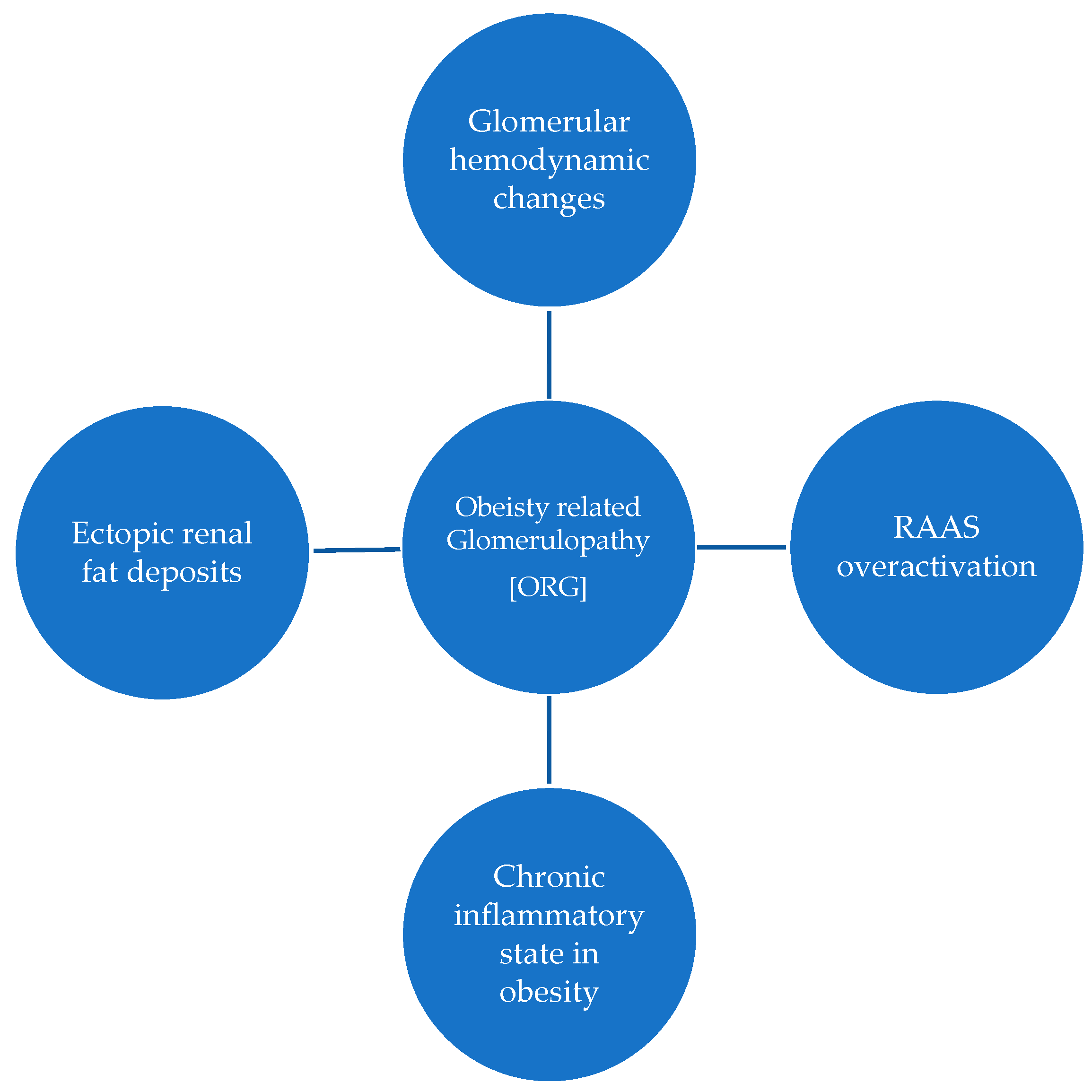 - Guan, Y.; Wei, X.; Li, J.; Zhu, Y.; Luo, P.; Luo, M. Obesity-related glomerulopathy: Recent advances in inflammatory mechanisms and related treatments. J. Leukoc. Biol. 2024, 115, 819–839. [Google Scholar] [CrossRef]