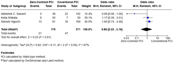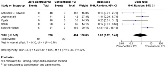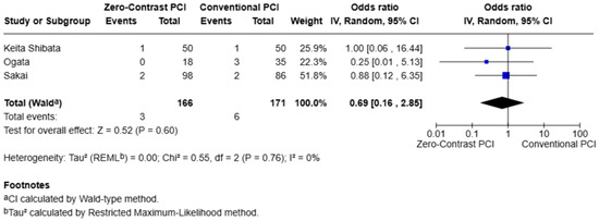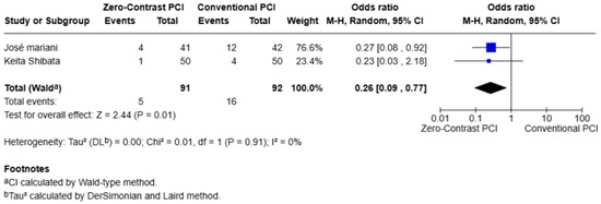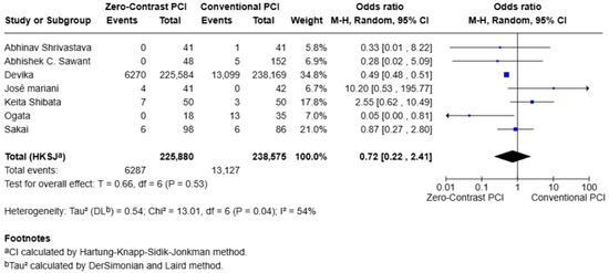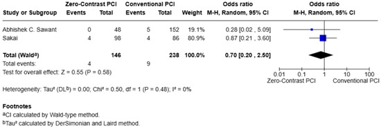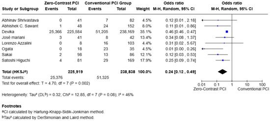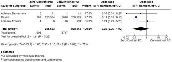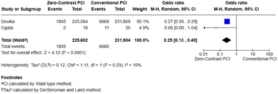 p < 0.05 considered statistically significant. Results: Across nine included studies (464,815 patients) evaluating zero-contrast or ultra-low-contrast PCI versus conventional PCI, zero-contrast PCI significantly reduced contrast-induced acute kidney injury (CI-AKI) (OR 0.24, 95% CI 0.12–0.49;