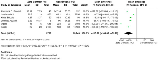 p = 0.002), decreased contrast volume (MD −110 mL, 95% CI −168.6 to −51.8;