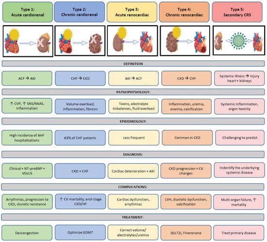 Therefore, it represents the confluence of heart–kidney interactions across several interfaces. Later, in September 2008, a consensus conference was held in Venice, sponsored by the Acute Dialysis Quality Initiative (ADQI), with experts and leaders in the fields of nephrology, critical care, cardiac surgery, and cardiology. This meeting resulted in a consensus document that established the definition and classification of CRS into five phenotypes as we know it today, depending on the organ initially injured and the acute or chronic nature of the damage [11]. The definitions, pathophysiological mechanisms, diagnostic features, and therapeutic principles of the different CRS subtypes are summarized in Figure 1.