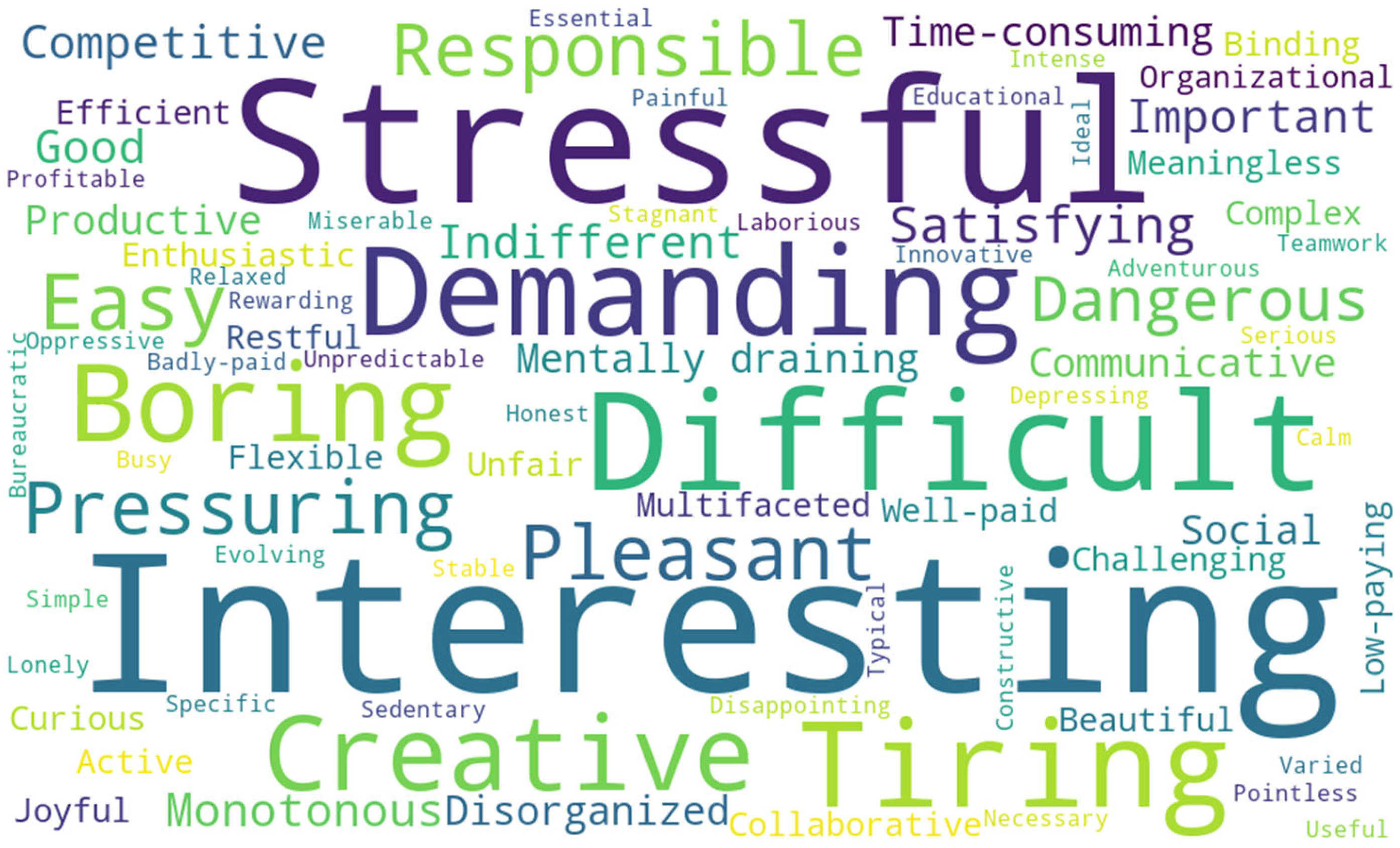 - The initial dictionary DoW characterizes work/job as a comprehensive entity. This dictionary was constructed in response to the inquiry, “What three to five adjectives come to mind when you think of your job”?” It is unnecessary to compose a list of nouns from the dictionary, as this semi-open question just pertains to adjectives directly associated with the occupation or job within its overall context. The sentiment analysis and score will be derived directly from the preprocessed list of adjectives. The preprocessing of the semi-question prior to the formation of this dictionary encompasses the regulations pertaining to the preprocessing approach outlined in Section 4.2. The assignment required manual intervention due to the algorithm’s inability to effectively eliminate many types of words, including nouns and verbs. This list, encompassing all responses for the semi-question, originally comprised 640 adjectives; however, following the previously indicated process, it currently has 536 adjectives. 102 adjectives that exhibit both positive and negative polarity are included in the DoW dictionary after the preprocessing.