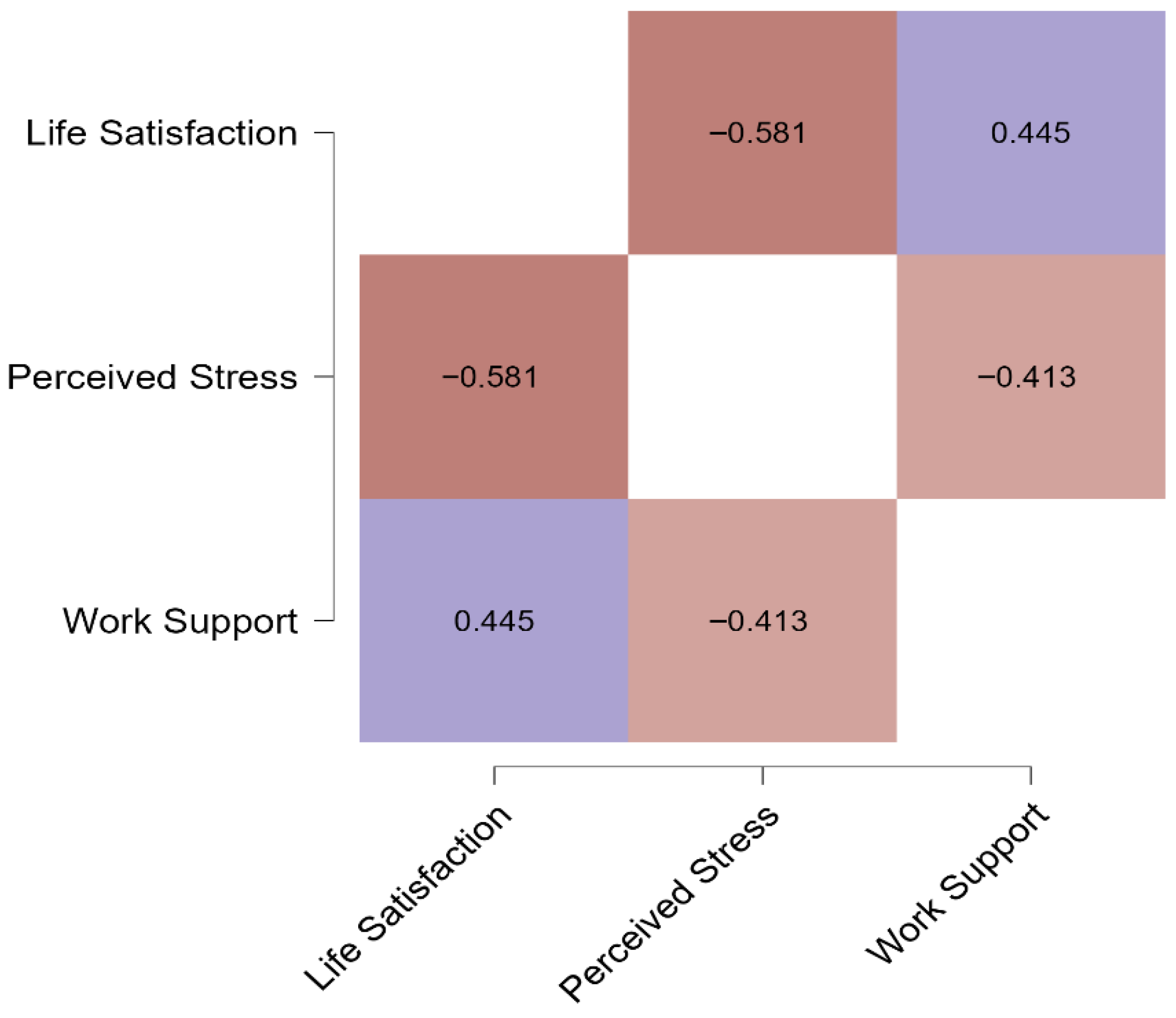 Figure 1). Significant correlations were found, namely a positive and moderate correlation between Work Support and Satisfaction with Life (r = 0.445,