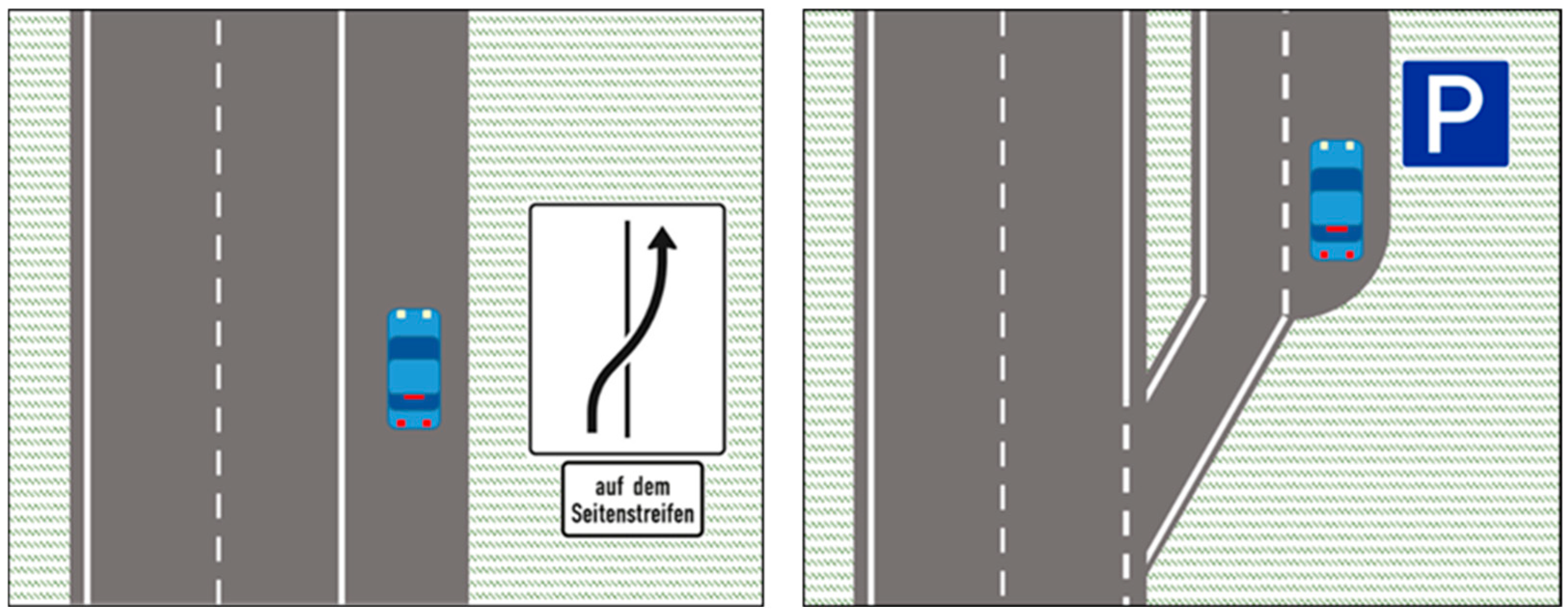 | Please imagine the following situation: You are getting near to the highway exit. After exiting the highway, you will have to drive the rest of your way to your destination. You will then again be responsible for your safety. [minimal risk condition “hard shoulder”] There is no rest area before the highway exit. However, the vehicle could stop on its own on the hard shoulder before the exit. We assume that stopping on the hard shoulder would be permitted in this case. [Presentation of Figure 1 left] [or minimal risk condition “rest area”] Shortly before the highway exit, there is a rest area where the vehicle could park itself. [Presentation of Figure 1 right] |