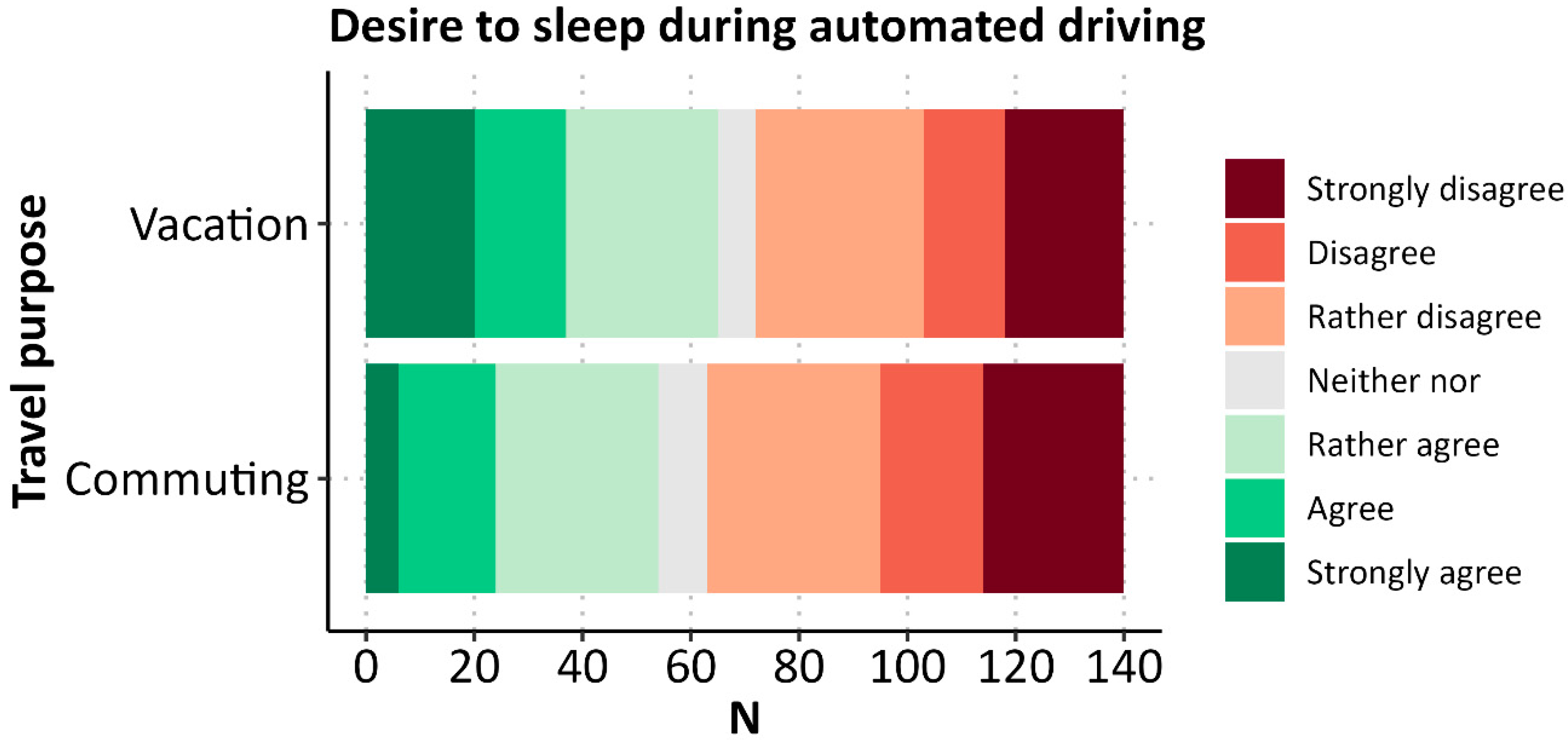 | The questions on the following pages relate to automated driving. This means that the vehicle drives completely autonomously on the highway and takes over all driving functions. You may turn your attention away from the traffic and engage in other activities, such as reading, working, or sleeping. The system can inform you in advance when you need to take back control of the steering wheel, e.g., when you are approaching a highway exit. Please imagine the following situation: [travel purpose condition “commuting”] You are commuting daily with your vehicle early in the morning. You are alone in your vehicle. Your drive lasts about 40 min. During the complete ride, you would have the possibility to activate the automation and could sleep. [or travel purpose condition “vacation trip”] You are going on holiday and are using your vehicle. You are alone in the vehicle. The drive lasts about six hours. You start your drive late in the evening and will reach your destination early in the morning. During the complete ride, you would have the possibility to activate the automation and could sleep. |