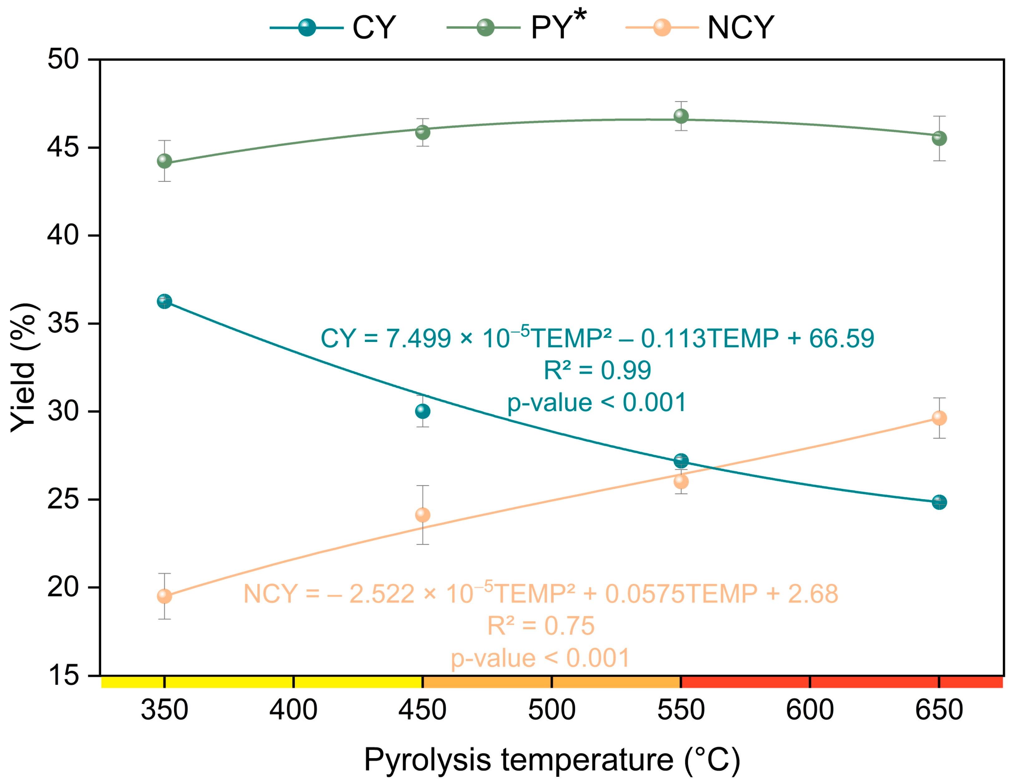 - Khater, E.S.; Bahnasawy, A.; Hamouda, R.; Sabahy, A.; Abbas, W.; Morsy, O.M. Biochar Production under Different Pyrolysis Temperatures with Different Types of Agricultural Wastes. Sci. Rep. 2024, 14, 2625. [Google Scholar] [CrossRef] [PubMed]