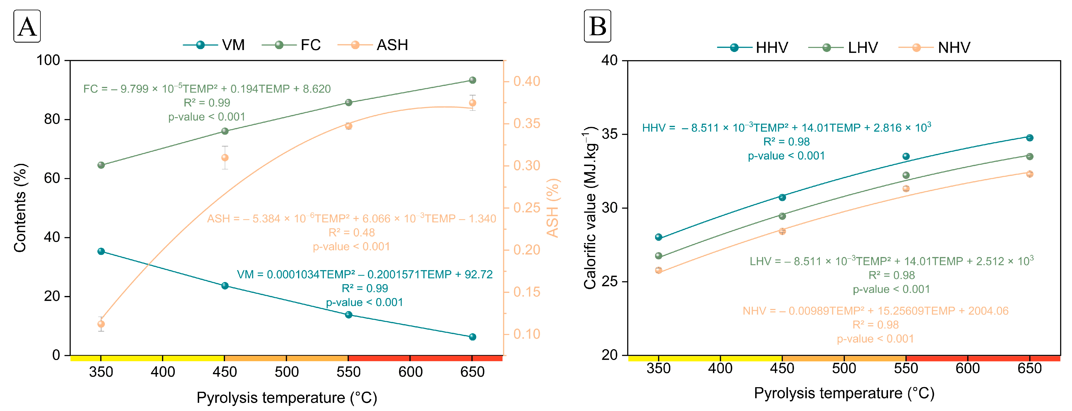 3.1. Pyrolysis Yield and Properties of Charcoal