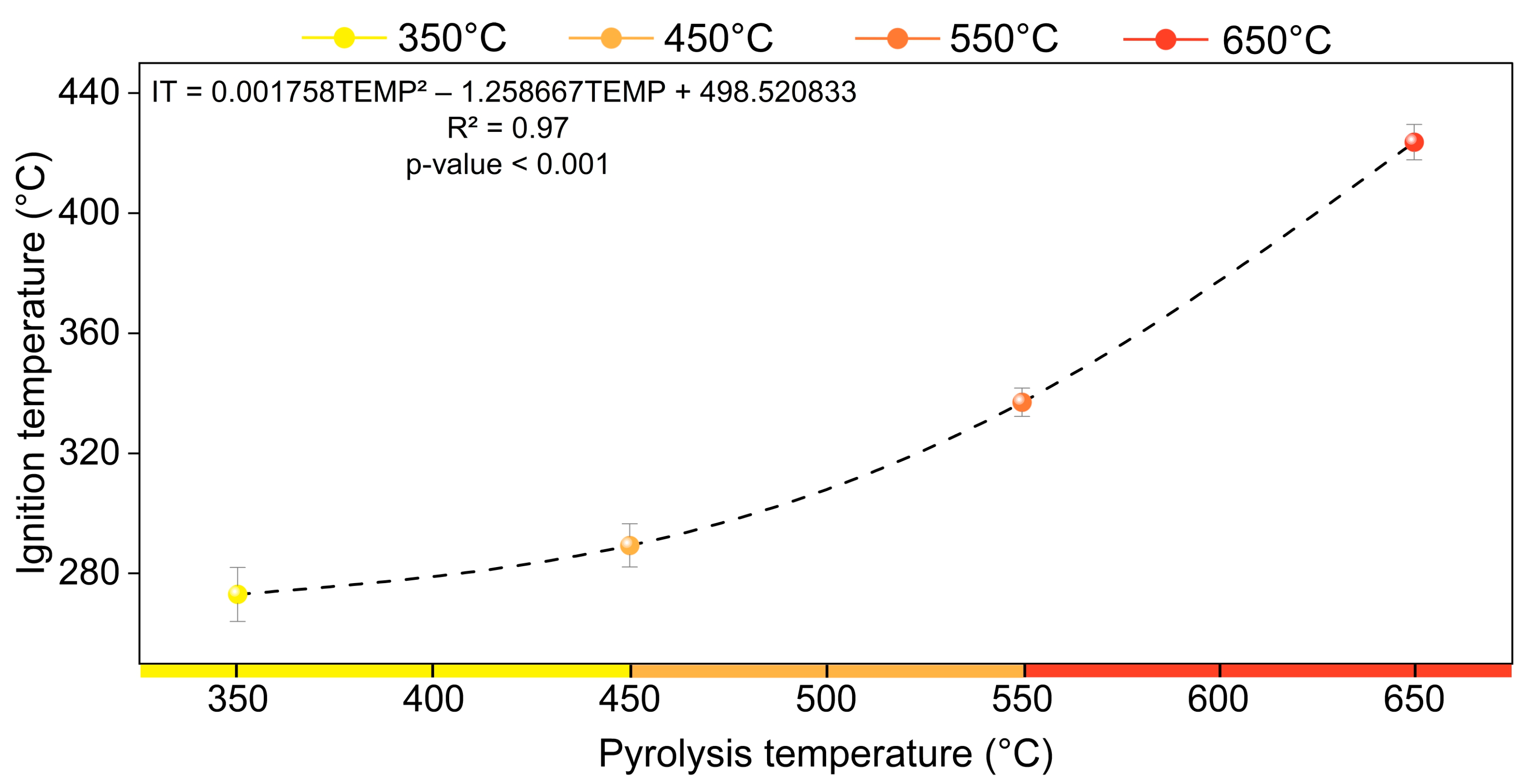 3.2. Ignition Temperature and Its Relationship with Charcoal Properties
