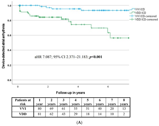 During the mean follow-up of 3.7 years, the incidence of device-detected atrial arrhythmia episodes was significantly higher in patients implanted with a VDD ICD system compared to the conventional single-lead ICD recipients (HR 6.506; 95% CI 2.176–19.446; p = 0.001; adjusted hazard ratio (aHR) 7.087; 95% CI 2.371–21.183; p < 0.001). However, univariate comparison of VDD vs. DDD systems revealed a higher rate of atrial arrhythmia detection in the DDD group; after adjustment for the clinically and statistically relevant confounders, no significant difference between the two devices was identified (aHR 1.781; 95% CI 0.737–4.301; p = 0.200) (Table 3, Tables S3 and S4, Figure 1A,B). Notably, the distribution of the different atrial arrhythmia episodes (paroxysmal atrial fibrillation, persistent atrial fibrillation, and regular atrial arrhythmia) within device detected atrial arrhythmias was similar among the three groups (p = 0.609) (Table S5).