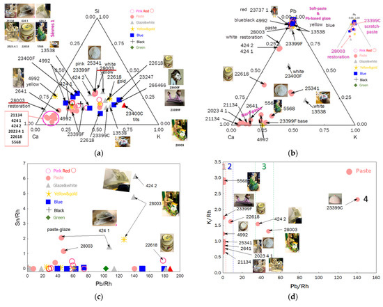 Ternary diagrams comparing the relative areas of characteristic XRF peaks of the elements Si-Ca-K (a) and Pb-Ca-K (b) for the pastes and the different colors of enamels (pink, red, white/colorless, blue, green, yellow/gilding, and black). Inventory numbers are given in Table 1. Binary Sn vs. Pb (c), K vs. Pb (d), Ca vs. Pb (e), and Sr vs. Rb (f) plots are given for the classification of different pastes: 1: hard-paste porcelain; 2: special paste or pollution during firing; 3: soft-paste porcelain; 4: soft-paste porcelain data contaminated by lead-reach glaze blur; S: Sèvres; L: Limoges; Ch: Chantilly. The inventory numbers XXX (MNC XXX) are given.