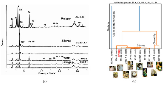 Examination of the XRF spectra from the main factories of the mid-18th century (Figure 14a) highlights that the key differences involve the relative proportions of Si/K/Ca for the major elements and Rb/Sr/Zr for the trace elements. The iron level is also a criterion for discrimination. Meissen paste is the richest in potassium, and since it is fired at very high temperatures, it forms more mullite compared to other porcelain bodies, which is also clearly visible in the Raman spectra [61,62]. The first productions of Sèvres are rich in calcium and contain less mullite. Porcelains from Venice and Limoges show intermediate characteristics (less calcium and more iron in the case of Venice). The addition of filters provides more precision in measuring low-intensity peaks [73,74] but requires longer counting times. The significant intensity of traces of Y, Rb, Sr, and even Zr negates the need for filters when access time to objects is limited. The value of these last three trace elements as a provenance marker has also been recognized in PIXE analyses [75].