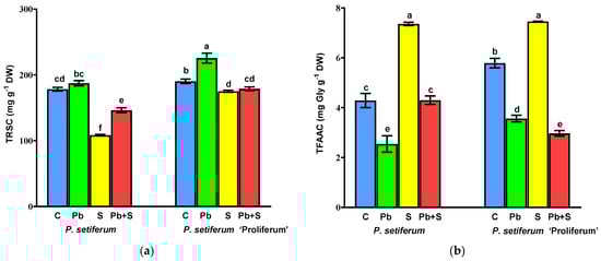 Effect of abiotic stresses on total reducing sugars content (TRSC) (a), total free amino acid content (TFAAC) (b), total polyphenol content (TPC) (c), and total flavonoid content (TFC) (d) of P. setiferum and P. setiferum ‘Proliferum’. Treatments: control (C), Pb stress (Pb), sunlight stress (S), Pb stress + sunlight stress (Pb + S). Vertical error bars represent the standard deviation of the mean (n = 3). Separate letters indicate significant differences at p < 0.05 (ANOVA, Tukey test) between the treatments and fern taxa.