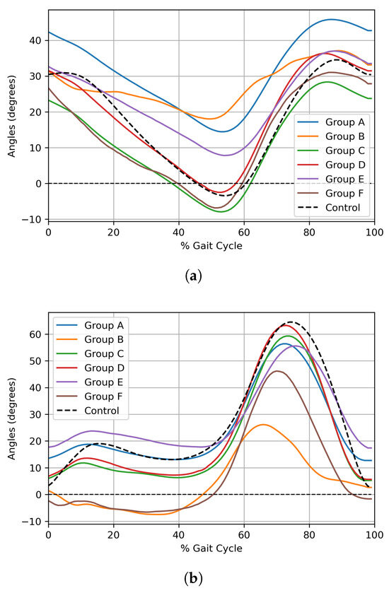 Figure 4 depicts the average joint angle trajectories on the affected side of the hip, knee, and ankle for each cluster, alongside the corresponding trajectories from the control group, and Table 5 lists the RMSE scores for the six groups. The control group is marked with a dotted line in order to be distinguished from the optimal clusters, and only the group averages are displayed as curves without their standard deviations to enhance visibility. In examining the gait patterns at hip, knee, and ankle joints across the six groups, distinct differences emerge in relation to the control group’s trajectories. Group A shows a trajectory at the knee joint closely aligned with the control but exhibits reduced peak dorsiflexion in the ankle and generally higher hip joint angles. Group B has the largest RMSE value of 17.6484, indicating the greatest deviation from the control group, with minimal differences in peak flexion and extension across the hip, knee, and ankle, resulting in the worst walking ability among six groups. Group C presents hip and knee joint trajectories that resemble the control, though the ankle shows reduced peak dorsiflexion. Group D displays the smallest RMSE value at 4.7918, indicating that its joint angle trajectories across all joints were closest to the control. Group E features a relatively large peak extension in the hip joint and reduced peak dorsiflexion in the ankle. Lastly, Group F lacks a loading response in the knee during the stance phase and shows reduced peak dorsiflexion in the ankle.