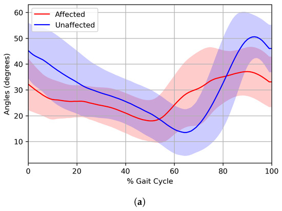 The averaged joint angle trajectories for Group B with the worst gait ability on the affected and unaffected sides are presented in Figure 5. In the figure, the trajectories for affected and unaffected sides are shown with different colors as solid lines and the standard deviation (1SD) as a shaded area. In the trajectories of the hip, the peak hip flexion of the unaffected side had a much larger angle value than the affected side. On the other hand, the peak hip extension was smaller on the unaffected than the affected side. This indicates that the arc containing extension and flexion was collapsed on the affected side of the hip. In addition, the starting angle of the hip joint was higher than that of the affected side and followed the angle of the normal control group. For knee kinematics, peak knee extension was not observed clearly at the stance phase of the affected; therefore, the loading response was poorly performed. In addition, in the swing phase, the angle of peak knee flexion from the unaffected side was larger than that of the affected side. At the ankle joint, the overall angle values of the unaffected were much larger than those of the affected side. Specifically, in the case of the affected side, the arc was collapsed; thus, the values of dorsiflexion and plantar flexion became very small compared with those of the unaffected side. Furthermore, on the affected side, dorsiflexion was poorly formed as the affected ankle joint could not reach the peak. Group B with the worst walking ability shows severe gait asymmetry between the affected and unaffected side.