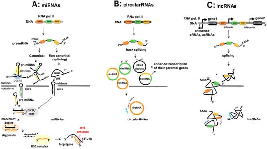 Similarities: The pre-mRNA transcript is processed by the spliceosome. While for circRNAs and lncRNAs, this is the main processing mechanism, it is not the case for every miRNA. There are non-canonical miRNAs, the mirtrons [], which are found in introns at the exon junction site of the pre-mRNA, and are spliceosome-dependent. In this section, we will also describe some exemptions to the canonical processing of lncRNAs.
