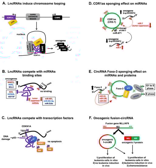 Interactions of ncRNAs in cancer. (A): LncRNA, CCAT1-L, interacts with the chromatin binding factor, CTCF. CCAT1-L is transcribed upstream of the oncogene MYC enhancer region, promotes chromosome looping that brings into proximity the super enhancer to the MYC promoter and induces enhanced transcription of MYC in colorectal cancer. (B): LncRNAs (XIST, HOTAIR, HOTTIP) compete with the binding of miRNA target genes. Each color corresponds to a lncRNA-oncogene-miRNA interaction. Tumor suppressor miRNAs cannot bind to their target oncogenes because they are sequestered by lncRNAs. (C): PANDA antisense transcription is induced by p53, counteracts CDKN1 inhibitory effect on the cell cycle and decoys the transcription factor NF-YA. The latter cannot bind anymore to the promoter of apoptotic activators such as APAF1, BIK, FAS. (TSS: transcriptional start site). (D): CDR1 decoys the tumor suppressor miR-7, which cannot bind to its oncogene targets. miR-671 cleaves CDR1 and alleviates miR-7 decoying. The latter is now able to suppress its targets. (E): Circ-Foxo3 forms a ternary complex with two cell cycle regulatory proteins, p21 and CDK2 to block the cell cycle progression. Foxo3 and circ-Foxo3 in a breast cancer cell line decreased cell proliferation and induced extensive cell death due to apoptosis in tumors formed by the same cell line in nude mice. (F): Chromosomal translocations of the oncogenes MLL/AF9 in AML produce the fusion of the due oncogenes to form fusion (f)-circM9 and a fusion protein. Both, f-circM9 together with the f-protein induced leukemia in vivo and resistance to chemotherapy.