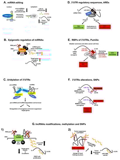 Disruption of ncRNA Networks in Cancer. (A): miRNA editing: in glioblastoma, ADAR2 edit the precursors of miR-222/221 and miR-21 and decrease expression of the corresponding oncomiRs in vitro and in vivo, (B): Epigenetic regulation: Methylation and deacetylation of miR-127 promoter suppresses expression of the tumor suppressor miRNA. Consequently, BCL6 oncogene expression increases. (C): Uridylation of miRNA and lncRNA: the enzyme TUTase adds Uridine groups at the 3′-end of pre-let-7 and the lncRNA Rmrp. Degradation of oligo-Uridine tails through the exonuclease Dis3L2 unified in the DMD pathway may explain the reduced expression of let-7 and other tumor suppressor miRNAs as well as lncRNAs deregulation in cancer. (D): 3′UTR regulatory sequences, ARES: ARES interact with micro-ribonucleoproteins (microRNPs) such as AGO2 as a complex with other proteins to regulate the stability and translation of mRNAs in response to external or internal stimuli. miR-369-3 binds ARES, AGO2 and fragile X mental retardation-related protein 1 (FXR1) complex to induce translation of TNFα, in serum starved HEK293 and HeLa cell lines. When cells start to proliferate, miR-369-3 inhibits TNFα. (E): RBPs of 3′UTR, Pumilio: Bladder carcinomas selectively down-regulate miRNAs that cooperate with Pumilio to target E2F3, and multiple tumor cell lines shorten the 3′-end of the E2F3 mRNA, removing the Pumilio regulatory elements. (F): 3′UTR alterations SNPs: A somatic SNP in the 3′UTR of the oncogene MDM4 created a new binding site for miR-191. This miRNA suppressed only the oncogene MDM4-C allelic variant expression and retarded ovarian cancer progression and the tumor became chemosensitive. (G): LncRNA modifications: (1) Methylation: tumor suppressor, lncRNA MEG3, has binding sites for onco-miR-9, so that it does not bind its targets, FOXO1 and E-cadherin, in ESCC human cell lines. Promoter of lncRNA MEG3 is usually methylated in ESCC and cannot sequester miR-9 and this induces to proliferation of cancer cells. (2) SNPs: lncRNA PTENP1 polymorphism rs7853346 in GC, change the local folding structure of lncRNAPTENP1. The latter is not able to exert its decoying effect on miR-106b and miR-93, with a consequent reduction of the tumor suppressor PTEN gene expression.