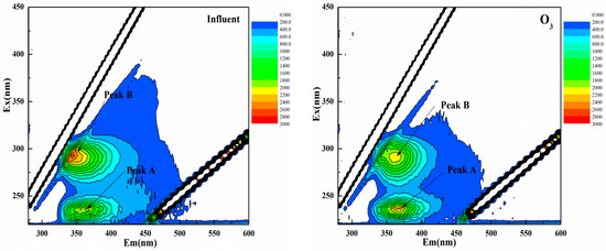 3.1. Effects of UF, O3, and Their Combination on Reduction of Fluorescence Intensity