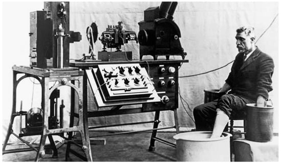 Before the invention of the ECG, diagnosing arrhythmias was based on physical examination and auscultation, which lacked precision and often failed to detect subtle or intermittent abnormalities. The introduction of the ECG revolutionised cardiology by providing a detailed and reproducible representation of the heart’s electrical activity []. ECG has long been regarded as the gold standard for diagnosing arrhythmias, a status maintained for over a century. The history of the ECG began in the early 20th century, when Dutch physiologist Willem Einthoven invented the first practical electrocardiograph in 1903. Einthoven’s innovative work, which earned him the Nobel Prize in 1924, relied on using a string galvanometer to record the heart’s electrical impulses (Figure 1). This breakthrough allowed for the visualisation of heart rhythms, enabling clinicians to detect abnormal patterns indicative of various cardiac conditions [].