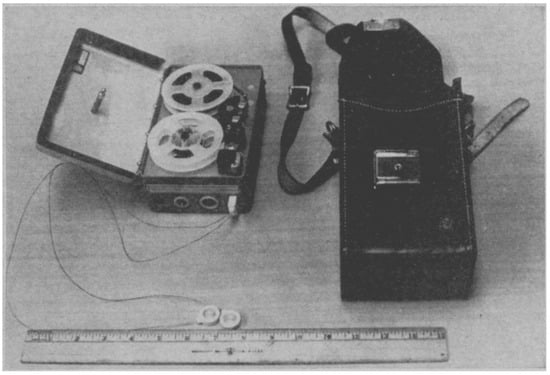 Old Holter monitor unit showing tape recorder, electrodes, and carrying case.