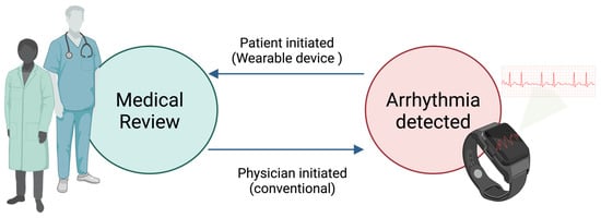 In recent years, there have been significant technological advancements in wearable devices, particularly smartwatches, for detecting arrhythmias. Despite being marketed as consumer gadgets, these advanced wearables can measure health data comparable to ambulatory electrocardiographic monitors. One notable advantage of these devices is their ability to provide continuous monitoring with minimal restrictions; some are equipped with advanced technologies capable of automatically detecting irregular, slow, or fast abnormal rhythms. This capability is particularly crucial for identifying infrequent and asymptomatic arrhythmias, thereby aiding in managing the affected individuals. However, this advantage comes with the risk of oversensing certain arrhythmias, potentially leading to unnecessary anxiety for the wearer and unnecessary hospital visits. Wearable devices have achieved an unprecedented milestone in the healthcare system’s history; they have inverted the paradigm of healthcare delivery (Figure 3). Contrary to the usual, where the patient seeks medical advice and presents to a health care practitioner for further investigations of their symptoms, with wearable devices detecting arrhythmias, those patients seek medical services after their devices detect possible arrhythmias and inform them of them [].