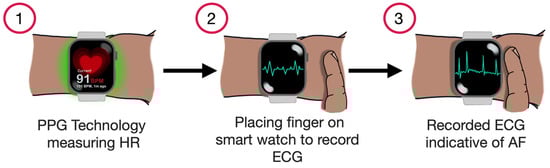 The latest generation of smartwatches can also generate a single-lead ECG by utilising the watch’s body and crown as two distinct electrodes. When worn on the left wrist and with one of the right-hand fingers placed on the crown, the device generates a waveform corresponding to lead I of a conventional 12-lead ECG (Figure 4). However, it has limitations, especially for unstable arrhythmias. For instance, capturing data requires a 30 s recording window, which can be inconvenient. Moreover, environmental noise and movement of the arm during recording may lead to errors or false readings [,]. Another possibility is that, by varying the smartwatch’s position on different body parts, it is possible to capture waveforms replicating other leads of the standard 12-lead ECG [].