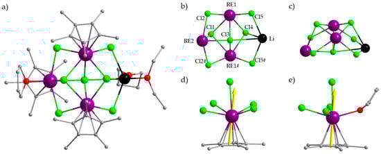 As revealed by X-ray diffraction, the nine RE3 isostructural compounds crystallized in the same orthorhombic noncentrosymmetric space group Pmn21 (Table S1). The cluster-type molecule (Figure 1a) for RE3 consists of three {Cp*RE} units, one Li+, seven Cl−, and three coordinated solvent molecules, which include two THF and one Et2O. The three {Cp*RE} fragments and the Li+ ion are interconnected by four μ2-Cl, two μ3-Cl, and one μ4-Cl (Figure 1b), resulting in a distorted heterometallic tetrahedron (Figure 1c). The μ4-Cl ion is situated within a seesaw-type polyhedron formed by four metal ions, which have been documented in a limited number of rare-earth clusters [,,,,]. It is noteworthy that the structures of these clusters bear resemblance to [Cp*LuCl2]3[LiCl(THF)2], which was identified as a byproduct during the activation of white phosphorus with organometallic rare-earth complexes []. The primary distinction lies in the coordination environments of the Li+ ions. In this study’s RE3 complex, the Li+ ion at the vertex of [Cp*RE]3 is coordinated to one Et2O molecule and one disordered THF molecule. In contrast, it is coordinated with two THF molecules in [Cp*LuCl2]3[LiCl(THF)2].