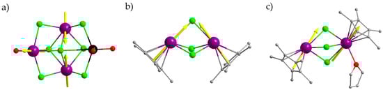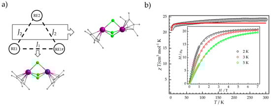 All three RE(III) ions in RE3 are capped by a Cp*, with RE1 and RE1# coordinated to five Cl− ligands, while RE2 is associated with four Cl− ligands and one oxygen atom from THF. The distances between the RE and Cl bonds, ranging from 2.54 Å to 3.00 Å (Tables S2–S10), align well with those reported for other RE–Cl compounds [,,,]. Similarly, the distances of the RE–C bonds fall within the range of 2.54–2.68 Å (Tables S2–S10), and the distances from the RE(III) ions to the centroid of the coordinated Cp* rings vary from 2.31 Å to 2.36 Å (Tables S2–S10). These measurements also correspond closely with previously documented values for RE-Cp* complexes [,,,,,,,]. The three RE ions are interconnected through three bridging Cl atoms, resulting in an interionic distance ranging from 3.92 Å to 4.05 Å (Table S11). Notably, it should be mentioned that RE1 and RE1# are bridged by two μ3-Cl ligands and one μ4-Cl ligand; conversely, either pair consisting of (RE1 and RE2) or (RE1# and RE2) is connected via one μ2-Cl ligand along with one μ3-Cl ligand and one μ4-Cl ligand. This distinction results in slightly longer interionic distances for the former case than those observed in the latter. Furthermore, in terms of coordination geometry, the Cp* ligands attached to [RECl3RE] units (Figure 2a) adopt a ‘cis conformation’ in cases involving both RE1 and RE1#, whereas they exhibit a ‘trans conformation’ when considering pairs such as (RE1 and RE2) or (RE1# and RE2). This variation may influence different magnetic exchange couplings, as discussed further below.