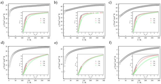 The χT versus T plot for (a) Tb3, (b) Dy3, (c) Ho3, (d) Er3, (e) Tm3, and (f) Yb3 under a 1000 Oe DC field. Inset: the field-dependent magnetization plots at indicated temperatures.