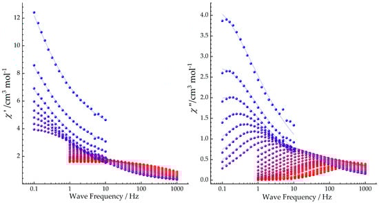 The in-phase (χ′, left) and out-of-phase (χ″, right) frequency-dependent AC susceptibility signals for Dy3 under a zero DC field, measured from 2 K (blue) to 23 K (red). The solid lines represent the best fit according to the generalized Debye model.