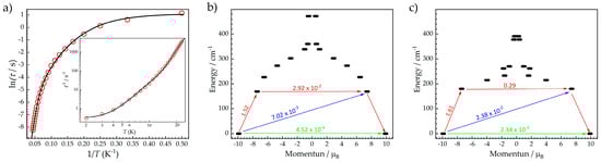 The ln(τ) vs. 1/T plots for Dy3 (inset: log–log version for plot of the magnetic relaxation rate versus the temperature for Dy3) (a). The solid lines best fit with Equation (1), including the Orbach, Raman, and QTM processes. The electronic states from the CASSCF-SO calculations for Dy1 (b) and Dy2 (c) in Dy3. The thick black lines represent the Kramers doublets as a function of their magnetic moment along the magnetic axis. The red arrows represent the most probable relaxation pathway for the Orbach process. The green lines correspond to the QTM through the ground states. The blue line represents the off-diagonal relaxation process. The numbers at each arrow represent the mean absolute value of the corresponding matrix element of the transition magnetic moment.