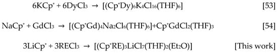 - Shen, Q.; Qi, M.; Lin, Y. Synthesis and X-ray crystal structure of a monopentamethylcyclopentadienyl derivative of gadolinium {Na(μ-THF)[Cp*Gd(THF)]2(μ-Cl)2}2·6THF. J. Organomet. Chem. 1990, 399, 247–254. [Google Scholar] [CrossRef]