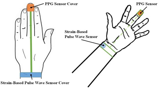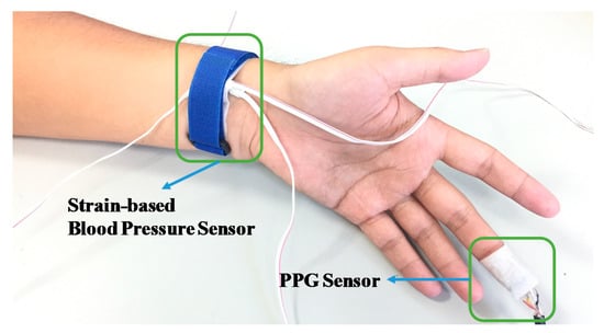 Another method for continuous monitoring of BP is based on pulse transit time [,]. This approach involves placing two sensors on two body areas to measure the pulse wave velocity (PWV) or the pulse transit time (PTT). Subsequently, the relationship of the measured PWV or PTT with BP is derived. The temporal resolution and effects of measurement noise for PWV calculation have been discussed []. The present study employed a novel hybrid of mechanical and optical sensors for continuous monitoring of BP and PWV. A physical model for calculating BP based on pulse wave measurement was incorporated into the research procedures in which BP equations were derived based on PTT and skin strain to achieve accurate and continuous BP monitoring.