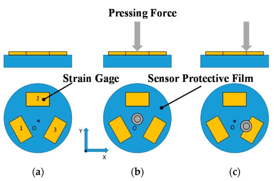 During BP measurement, pressing force and location variation may influence the applicability of the calibration parameters in the BP equation, thereby affecting the accuracy of BP estimation. In this study, a pressing force sensor was employed to calculate the pressing force applied to a certain point and ensure consistent measurement conditions. Specifically, the pressing force sensor, comprising an elastic body and three strain gauges arranged in an equilateral triangle, was employed to identify the magnitude and location of the pressing force. Figure 2 illustrates the proposed pressing force sensor for situations in which no, centric, and eccentric pressing forces are applied. Based on the strain detected by the three sensors, the magnitudes and locations of the resultant pressing forces can be calculated.
