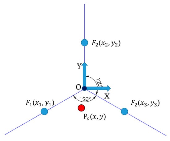 Based on the three strain gauges, pressing force (F1~3) components are acquired (Figure 3). According to forces (F1~3) and corresponding locations, the location of the resultant pressing force is evaluated using Equations (8) and (9).