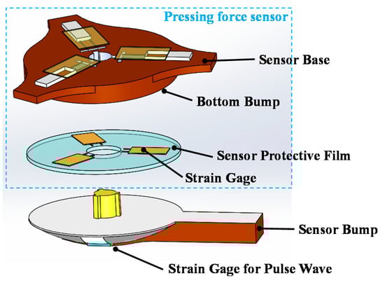 The strain-based pulse wave sensor is composed of a strain gauge, which measures radial artery pulse waves, and a pressing force sensor, which detects pressing force in the measurement (Figure 4). The pressing force sensor is used to ensure the repeatability of the pressing force in the measurement. The pressing force sensor comprises a sensor base, sensor protective film with three stain gauges, and sensor bump. The upper sensor base features three wire holes that the wires of the strain gauges located below can pass through and thereby be covered with polyimide films that protect subjects from direct contact with the wires. Three circular bumps at the bottom of the sensor base strengths the gauge sensitivity. A soft silicon film serves as a flexible buffer film to enlarge the pressing force signal. The sensor bump in the bottom features a guide shaft that is used to assemble the bump with the other components. In addition, a cross-shaped protrusion is designed on the sensor bump to facilitate positioning. Figure 5 displays photos of the proposed strain-base sensor. The strain gauge for pulse wave measurement is attached to the wrist skin with pressing force provided by the wrist belt.