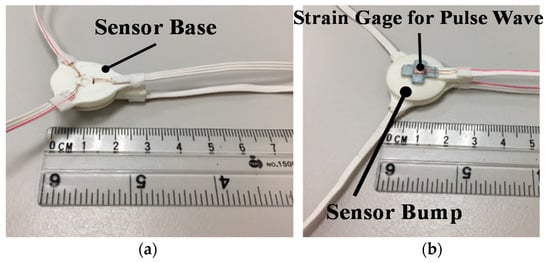 Photographs of the proposed strain-based pulse wave sensor. (a) Top of the sensor (through which the conducting wires are channeled). (b) Bottom of the sensor (where strain gauges are attached).