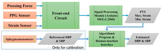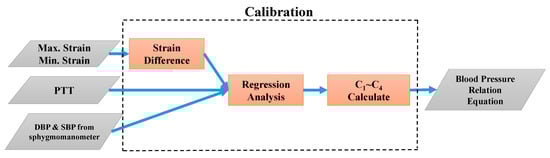 In this study, the analog strain and PPG signals were converted into digital signals using an Arduino microcontroller in the signal processing module. The calculated PTT and the maximum and minimum strain values were input into LabVIEW, a graphical programming platform, to facilitate the development of an algorithmic program and a human–machine interface. In the first stage, the calibration parameters were evaluated on LabVIEW as depicted in Figure 9. In the second stage, the BP equations were used to perform continuous BP estimation, the process of which is illustrated in Figure 10.