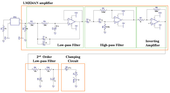 PPG sensors were integrated with the proposed strain-based pulse wave sensor to obtain adequate PTT and skin-strain data for estimating BP. Thus, at this stage, the BP measuring system consists of four components: A front-end circuit, signal processing module, algorithmic program, and human–machine interface (listed according to the order of usage; Figure 6). The front-end circuit comprises a strain-sensing circuit and a PPG readout circuit, schematic diagrams of which are presented in Figure 7 and Figure 8, respectively. In the experiments, the signal processing module, realized by Arduino MEGA 2560 (Arduino, Ivrea, Italy) with the sample rate of 5 kHz, was used to receive signals from the front-end circuit. Estimations of the calibration parameters and BP were performed in an algorithmic program using LabVIEW (8.0, National Instruments, Austin, TX, USA). Skin strain was measured on the basis of output voltage signals from a Wheatstone bridge circuit. However, because the strain value produced by radial artery pulses was 10−5 to 10−4, the output voltage signals in the model were only a few microvolts. Therefore, an instrumentation amplifier (INA 128P, Texas Instruments, Dallas, TX, USA) was employed for first-stage signal amplification. Following first-stage signal amplification, the reference potential was modified through an alternating current coupling circuit to eliminate signal offset, and a second amplification circuit was used to obtain a higher signal amplification ratio. The average human heart rate is 60–100 beats per minute when an individual is in a state of calm, and the rate is higher when an individual is exercising. Thus, a second-order low-pass filter with a cutoff frequency of 10 Hz was used to filter out high-frequency noise, and a clamping circuit was employed to adjust the signal level. In the PPG readout circuit, an LM324AN amplifier (Texas Instruments, Dallas, TX, USA) was adopted to amplify PPG signals and thereby achieve band-pass filtering. A second-order low-pass filter with cutoff frequency of 10 Hz was also installed to filter out high-frequency noise, and a clamping circuit was used to adjust the signal level to comply with the range of the Arduino analog input port.