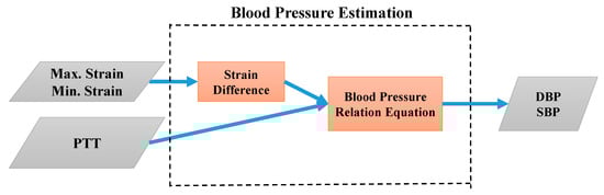 The strain induced by DBP () appears to arise from an initial strain () caused by a constant intravascular pressure (). Moreover, the PWV () can be expressed as , where denotes the distance between the finger and wrist sensors (i.e., the distance between the finger and radial artery). Therefore, Equation (3) can be expressed as: