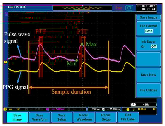 This study was subjected to ethical review and approved by the Institutional Review Board of the Kaohsiung Veterans General Hospital of Taiwan. The participants were informed about the process and purpose of the study in advance. The measurement experiment of the present study was divided into two stages. The objective of the first stage was to calculate calibration parameters. Two sets of data, reflecting measurements before and during exercise, were used to estimate the calibration parameters based on Equations (6) and (7). Each participant was assisted in identifying the location of their radial artery, wrapping the proposed strain-based pulse wave sensor around their wrist, and affixing the PPG sensor on the pulp of their middle finger (Figure 11). After the sensors had been positioned, the participants’ PPG and wrist-strain signals were continuously monitored, and a clinically validated sphygmomanometer (WatchBP O3, Microlife, Microlife AG, Widnau, Switzerland) was simultaneously employed to measure BP values from the participant’s other hand. The reference BPs were measured during exercise (as well as before and after). The PTT was estimated based on the time difference between the two peaks of the PPG and pulse wave signals, as illustrated in Figure 12. In general, the distance between the wrist and the fingertip among the participants was approximately 20 cm, and the PWV was approximately 10 m/s; accordingly, the 5-kHz sample rate of the microprocessor (Arduino MEGA 2560) provided 1–2-mmHg resolution of the estimated BP. The peak times were acquired from the derivatives of the PPG and pulse wave and were calculated in the microprocessor.